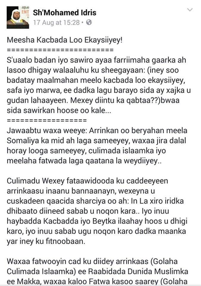 Maxamad Idriis, wuxuu ka mid ahaa, walina ka mid yahay ITXIAADKII bulshadan u horseeday halaagga WADAADDADA WAALLIDA WADAY, ee dalkan galiyey gacan Xabashi iyo cadaw waligiiba la doonayey luggooyo! Isweydii; beladii Maxaakiimta la’aanteeda, miyaa dalkan Xabashi soo geli leheed iyo dabcan gacan haatistii xerta Xabashida? Belada Shabaab la’aanteed, miyaa dalkan Kenya soo geli leheed? GABLAN!