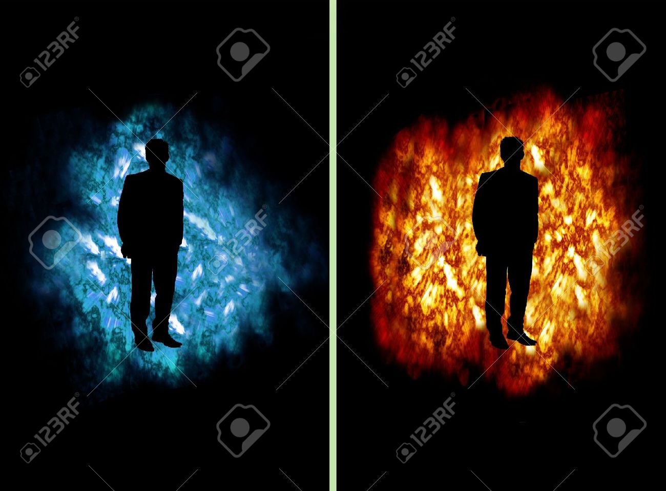 6498172-Business-man-on-fire-and-ice-cloud-Stock-Photo
